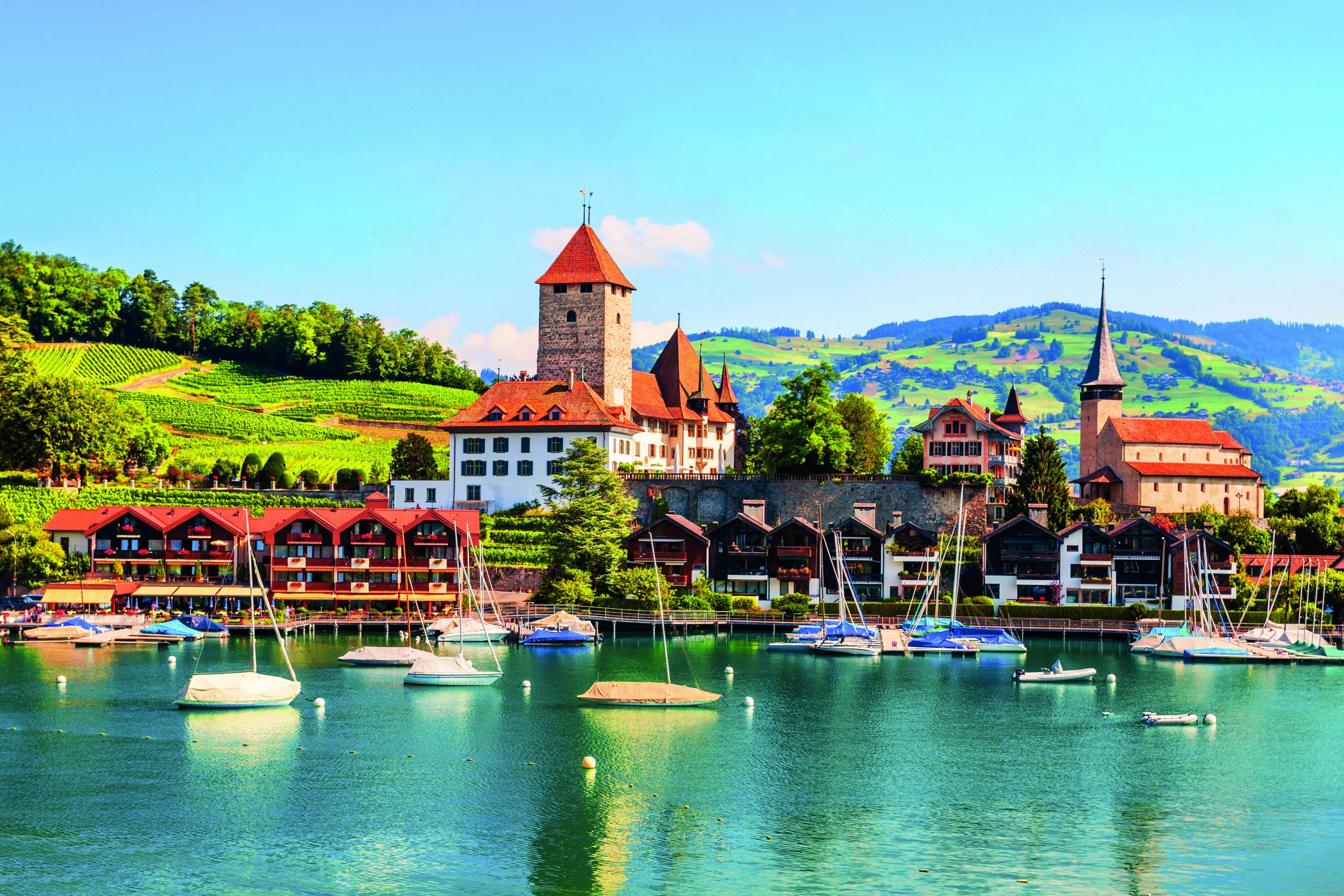 Après le petit déjeuner, départ vers Gruyères, petit bourg médiéval perché sur un éperon rocheux et qui a donné son nom à la région de La Gruyère et à son savoureux fromage, le Gruyère AOP. Arrêt dans une fromagerie, pour une visite audio-guidée suivie d’une dégustation. Puis, rencontre avec le guide et visite de ce charmant village pittoresque, avec ses rues pavées piétonnes, ses remparts et ses jolies maisons, le tout parsemé de points de vue sur les Préalpes fribourgeoises. Visite du château. Niché au cœur d’un paysage somptueux, ce château du XIIIe siècle est aujourd’hui un musée consacré à huit siècles d’architecture, d’histoire et de culture. Déjeuner au restaurant. Après-midi, reprise de la route en direction de Thoune, considérée comme l’une des plus belles villes de Suisse. Sous la conduite d’un guide, visite à pied de la vieille ville, située au bord de l’Aar, la rivière qui traverse la ville. Vous y apprécierez son atmosphère médiévale et son patrimoine architectural remarquable. Ses rues étroites et pavées sont bordées de maisons colorées à colombages. En fin de journée, installation à votre hôtel à Leissigen. Diner et nuit.